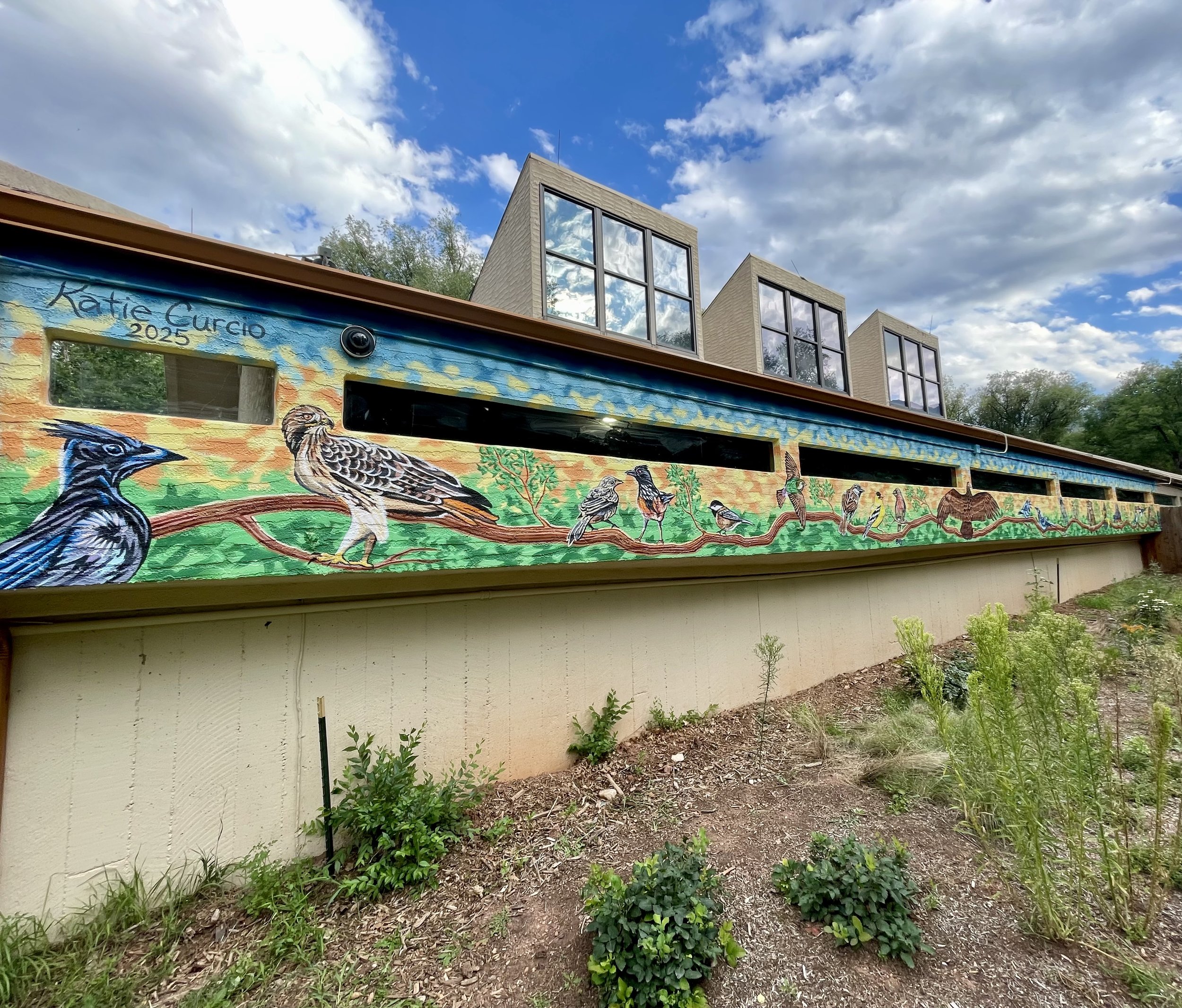 Located on the back of the Manitou Springs Pool & Fitness Center, this mural showcases local birds interacting with one another in a scene of communication, nurture, and instinct. This mural was awarded 2025 People’s Choice Award for new public art in Manitou Springs, Colorado.