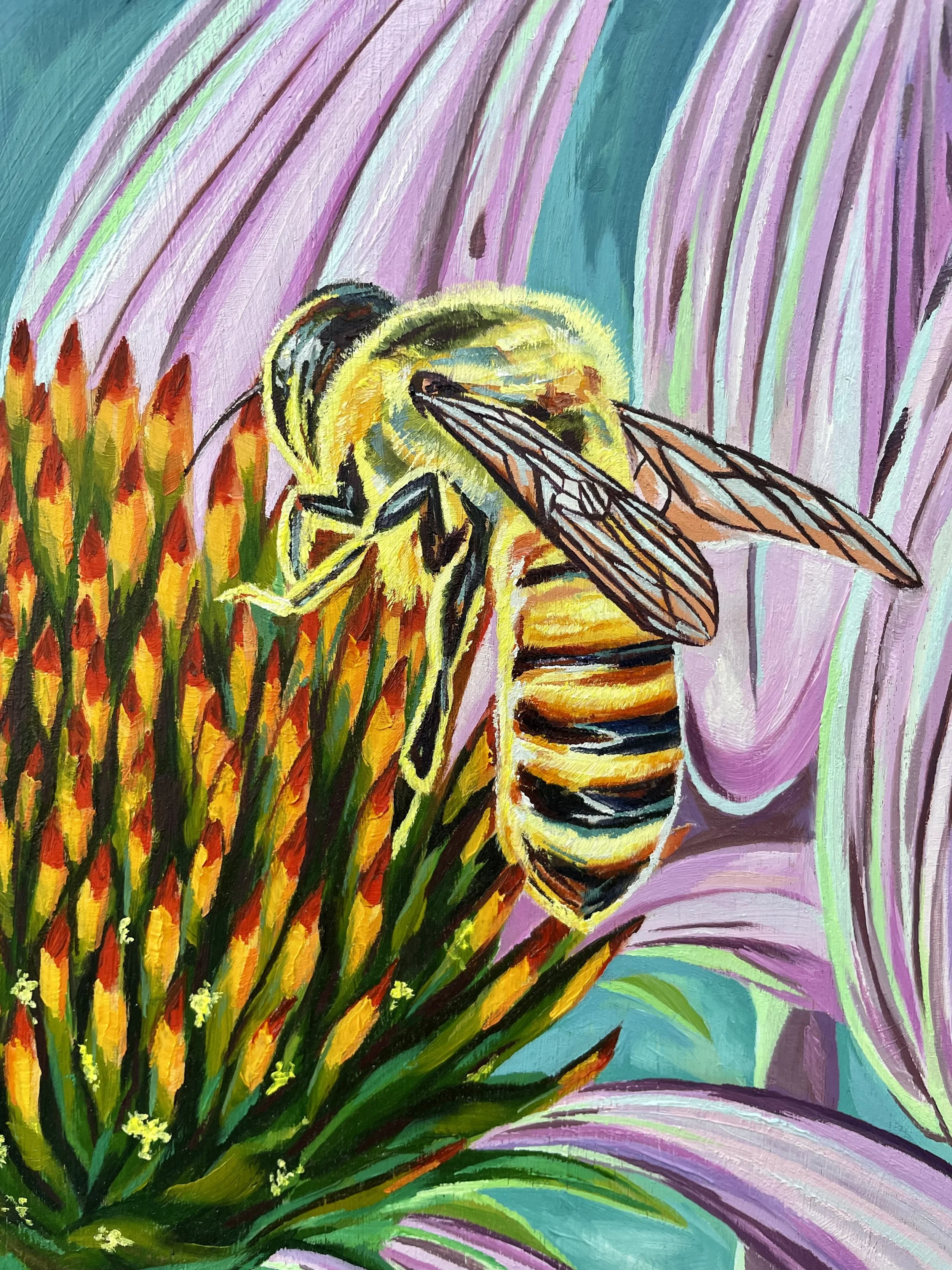 Painted in celebration of Manitou Springs becoming the world’s first certified municipal pollinator district, this piece honors the vital relationship between bees and native blooms. The honeybee rests on an echinacea flower, symbolizing resilience, interconnection, and the quiet harmony that sustains our ecosystems.