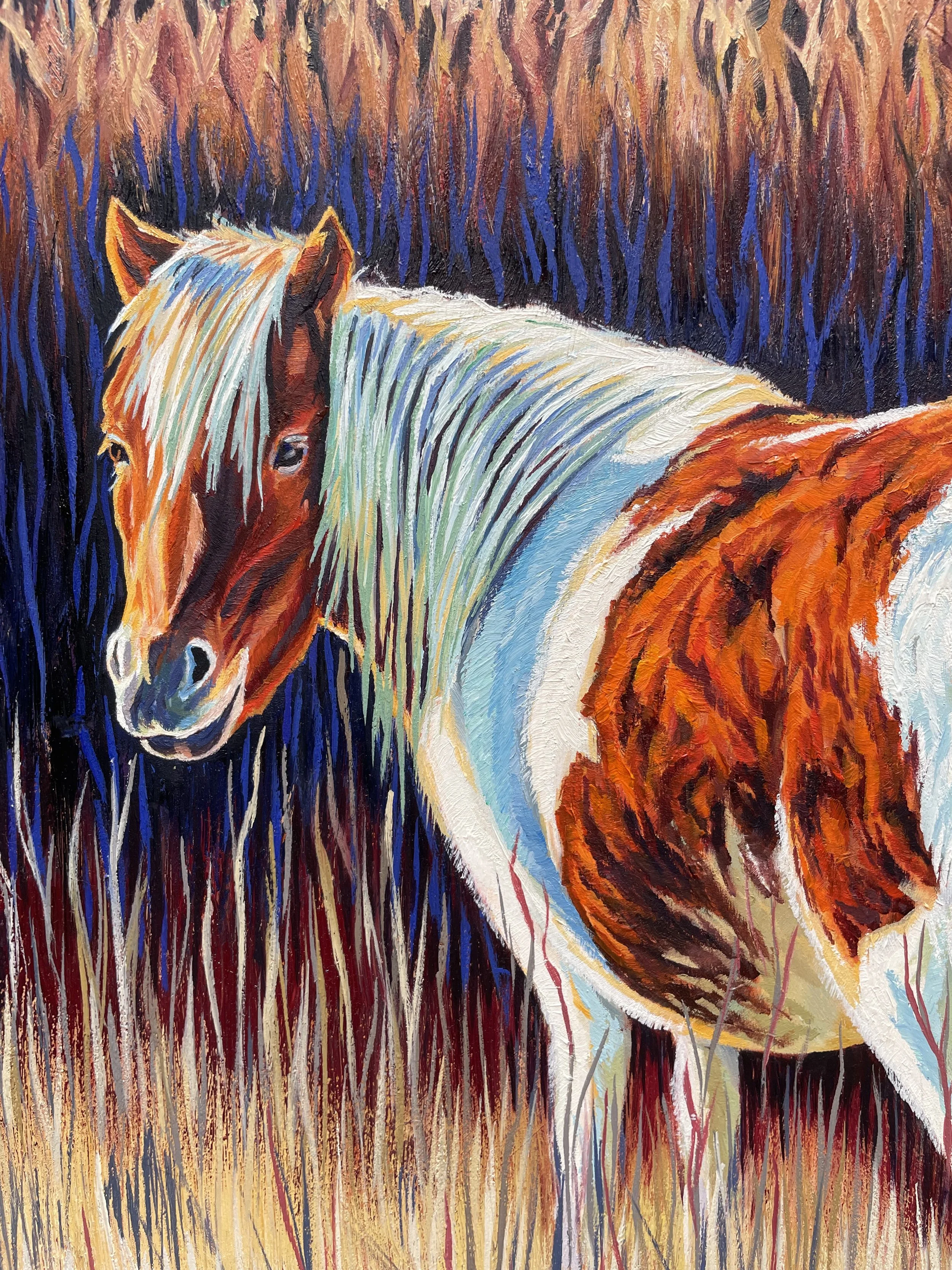 This painting was inspired by a wild pony wandering the misty ridges of Grayson Highlands in Virginia. I was struck by its calm presence and quiet strength in the cold air and open sky. The painting reflects that fleeting moment of connection, wildness, and stillness.