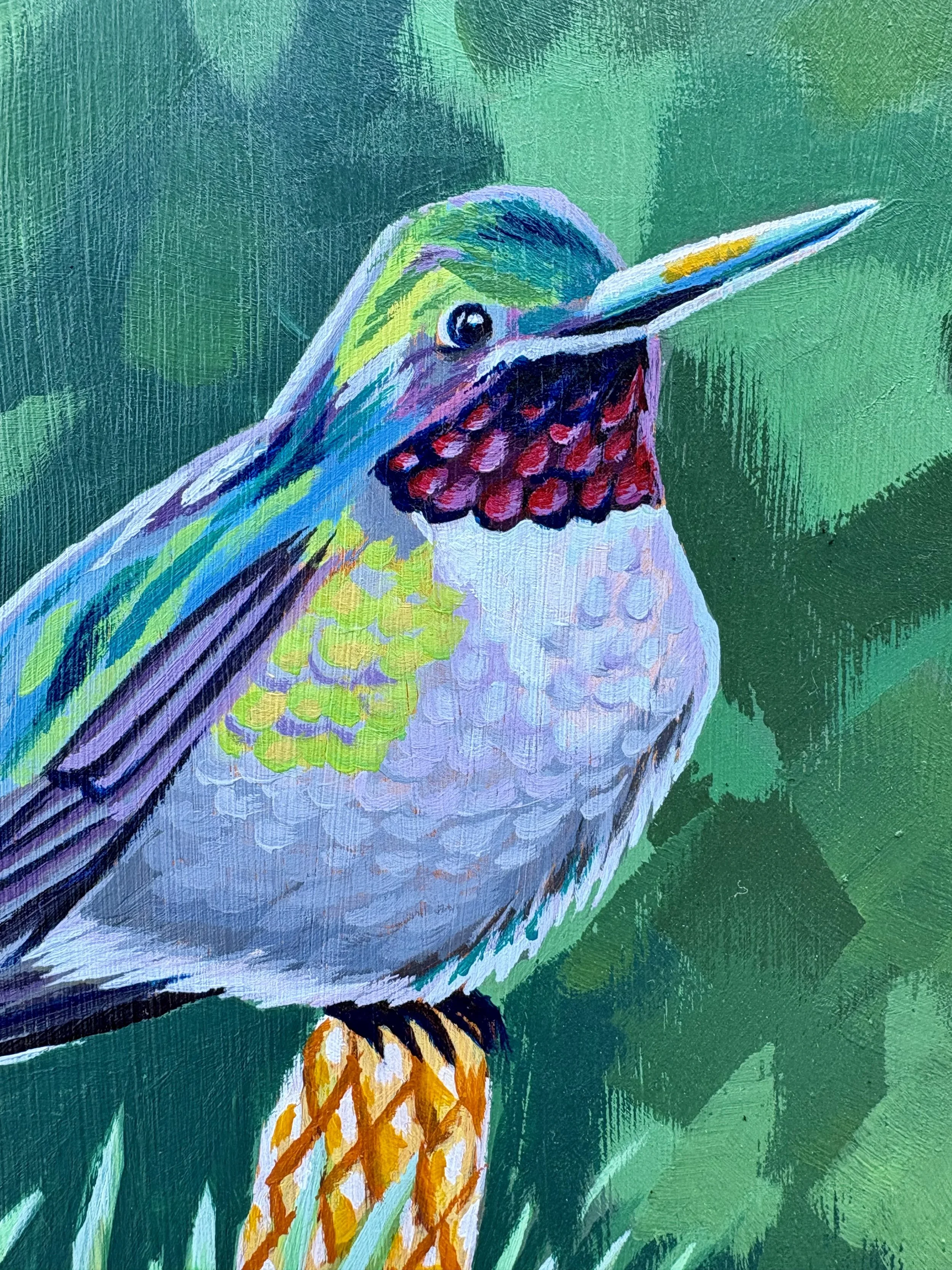 This painting captures the electric shimmer of a broad-tailed hummingbird resting on vegetation, its iridescent colors catching the light as it observes its surroundings. Painted with precision, the bird’s vivid details contrast against a simple, gestural, and atmospheric background that lets its colors take center stage. The loose, fluid strokes surrounding it evoke open air and movement, creating a sense of breath and space.